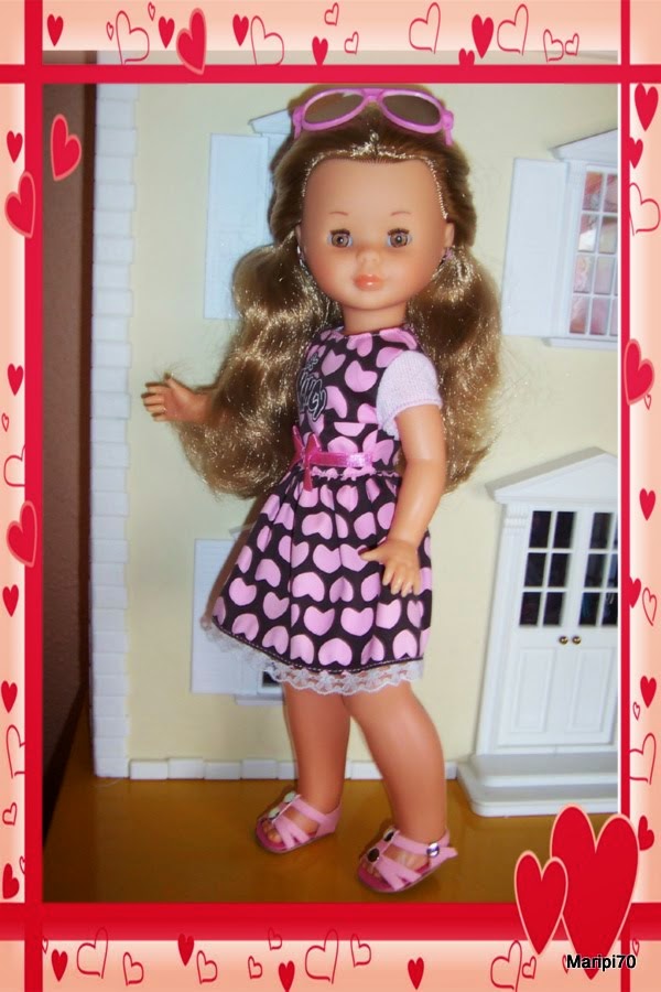 La siguiente modelo es Nancy Comunión 2009 que la teñí de morena y ahora le he cortado los flequillos (pobre, siempre experimento con ella), lleva una falda con corazones en tonos azules y una camiseta marrón chocolate y los zapatos de la colección de Merche Manoletinas Merchicukis