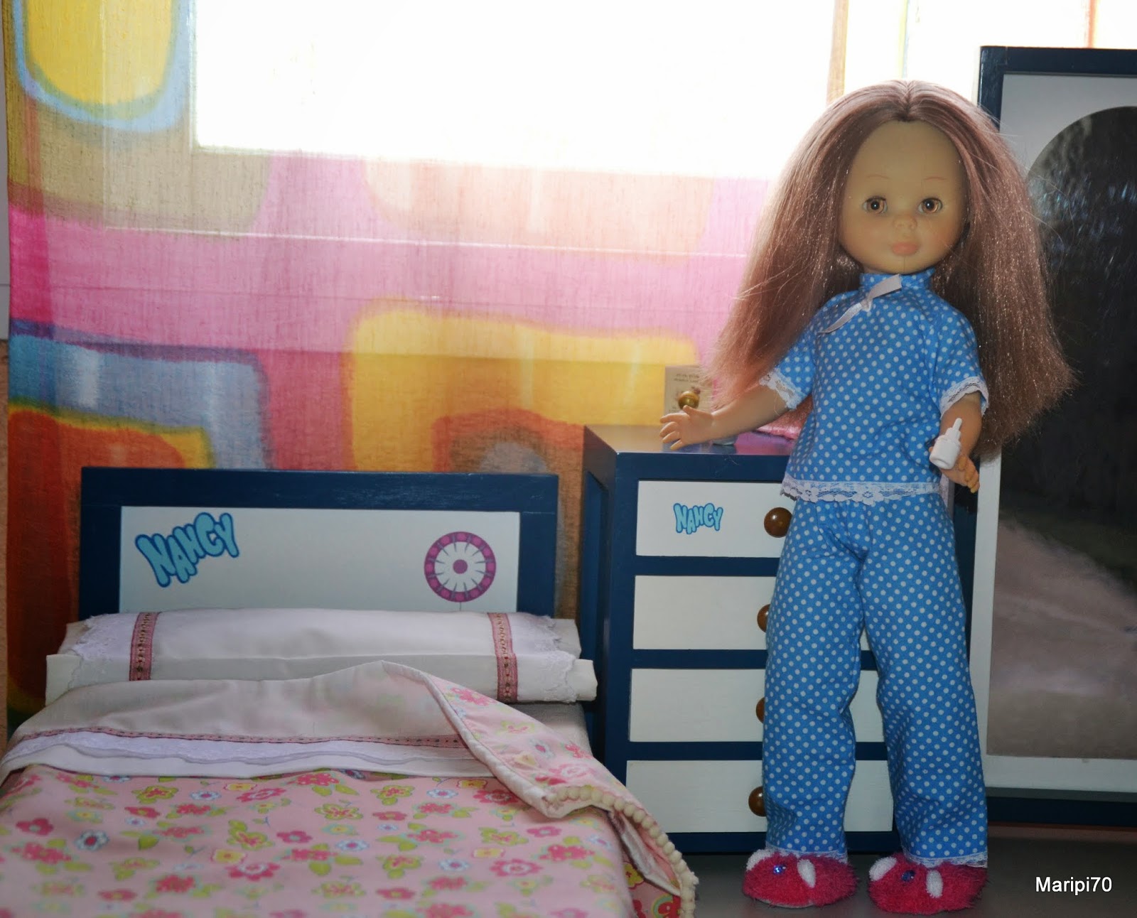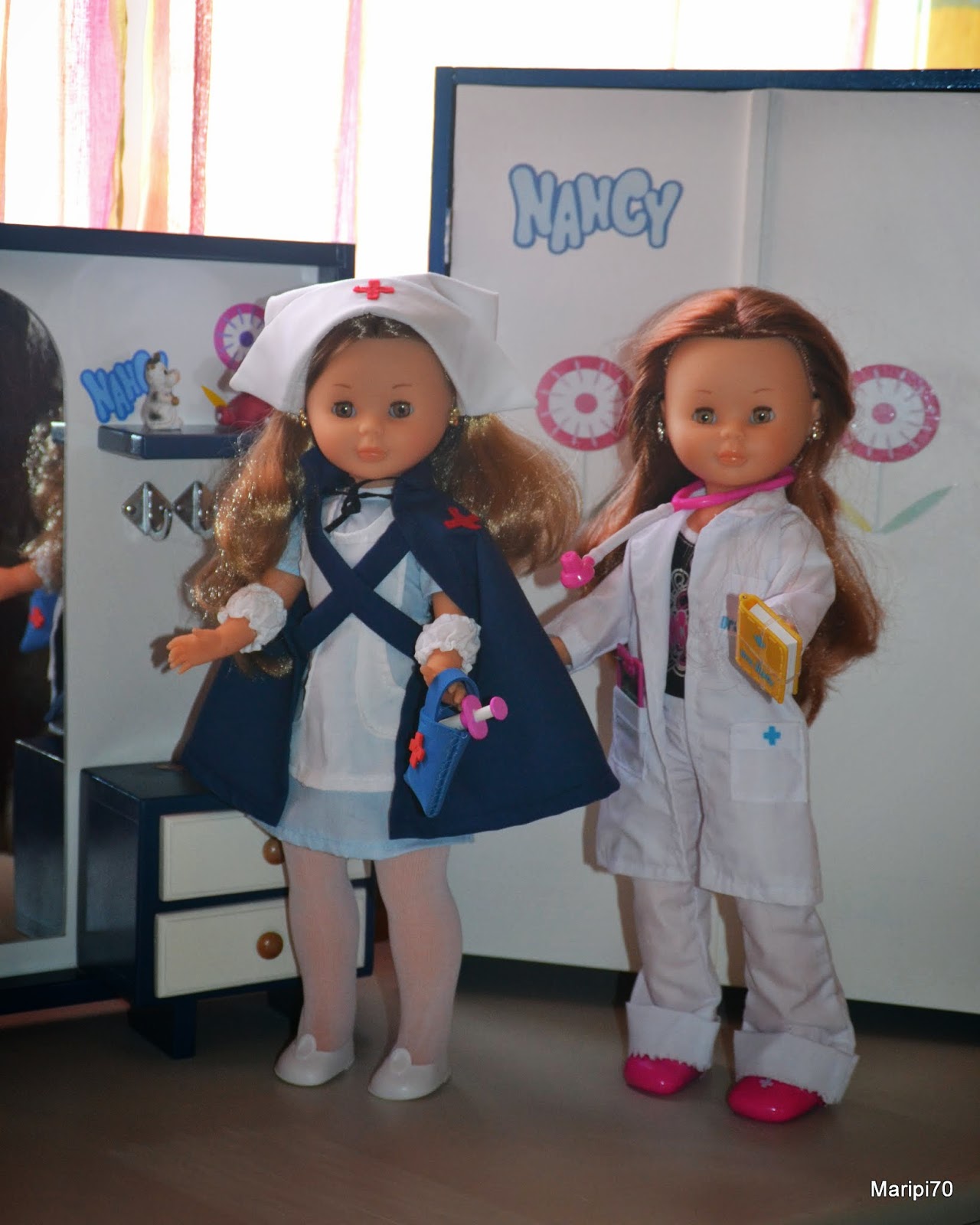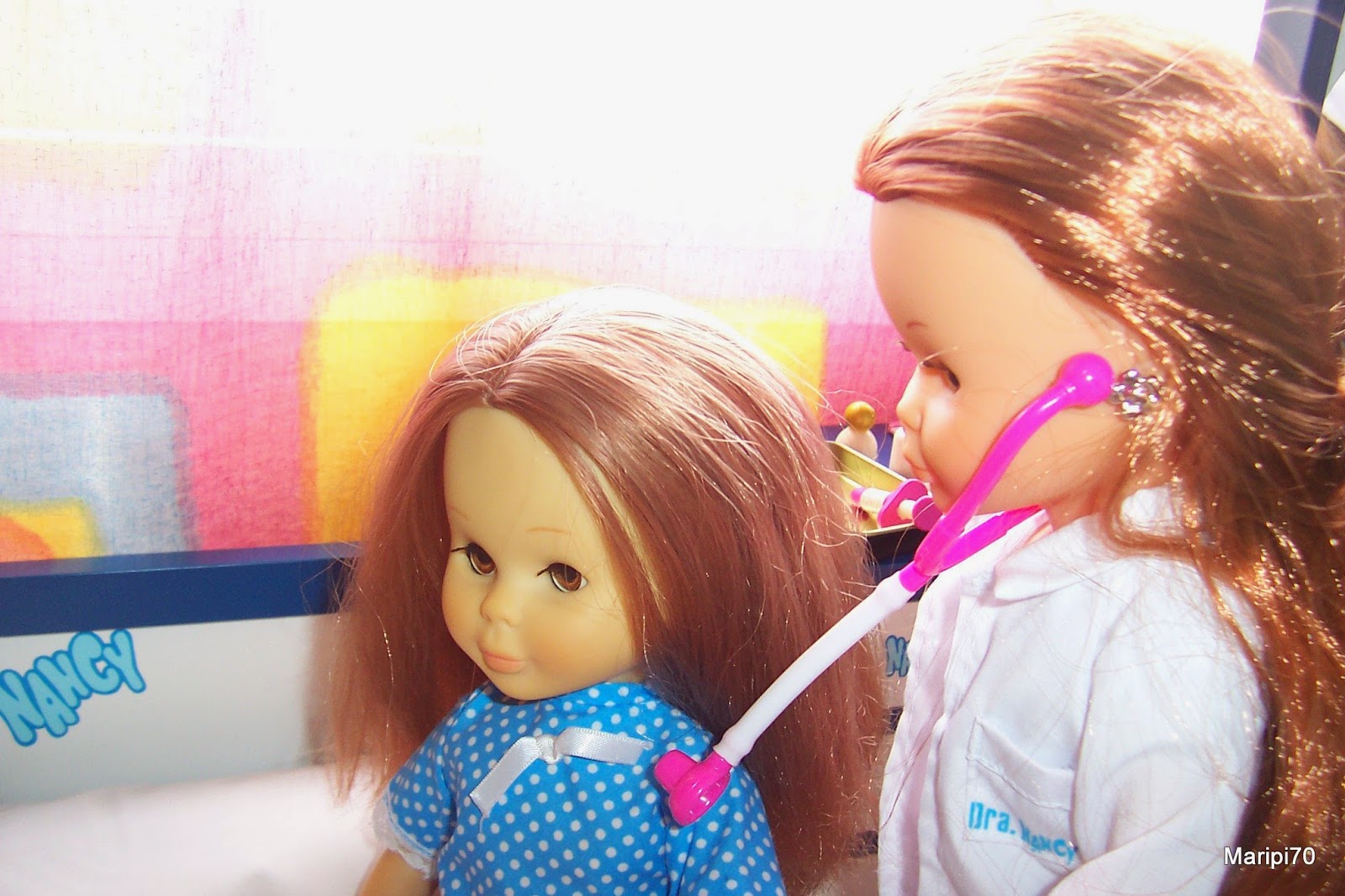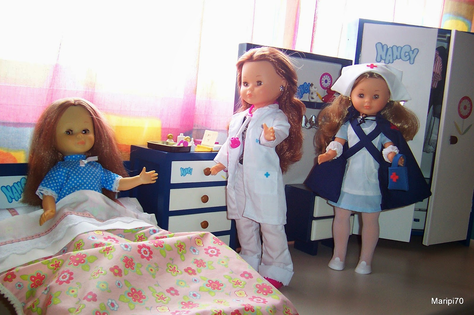Con estos cambios de tiempo que hoy hace frío y mañana calor, mi Nancy pelirroja articulada se ha puesto enferma .... pero está tranquila porque ha llamado a la doctora y a su enfermera para que vengan a reconocerla.